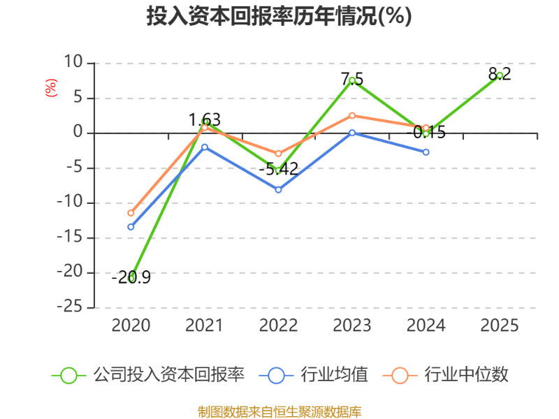 數(shù)據(jù)顯示,2025年公司加權(quán)平均凈資產(chǎn)收益率為12.84%,較上年同期上升20.37個百分點。公司2025年投入資本回報率為8.2%,較上年同期上升8.35個百分點。