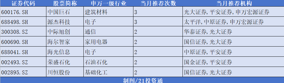 在統(tǒng)計(jì)的10余家券商3月金股中,中國(guó)巨石、源杰科技獲機(jī)構(gòu)3次推薦;中際旭創(chuàng)、海爾智家、海光信息等股緊隨其后獲2次推薦。