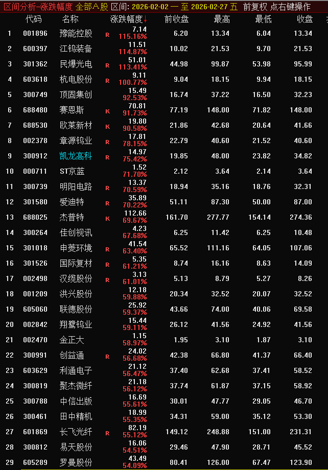 領(lǐng)漲個(gè)股中,豫能控股憑借連續(xù)7個(gè)漲停,最終以115.16%的漲幅,一躍成為2月“牛魔王”。同期江鎢裝備因最后7個(gè)交易日6天觸及漲停,以114.87%的漲幅位居亞軍。民爆光電以113.41%的漲幅名列季軍。杭電股份月漲幅100.77%列第四位。