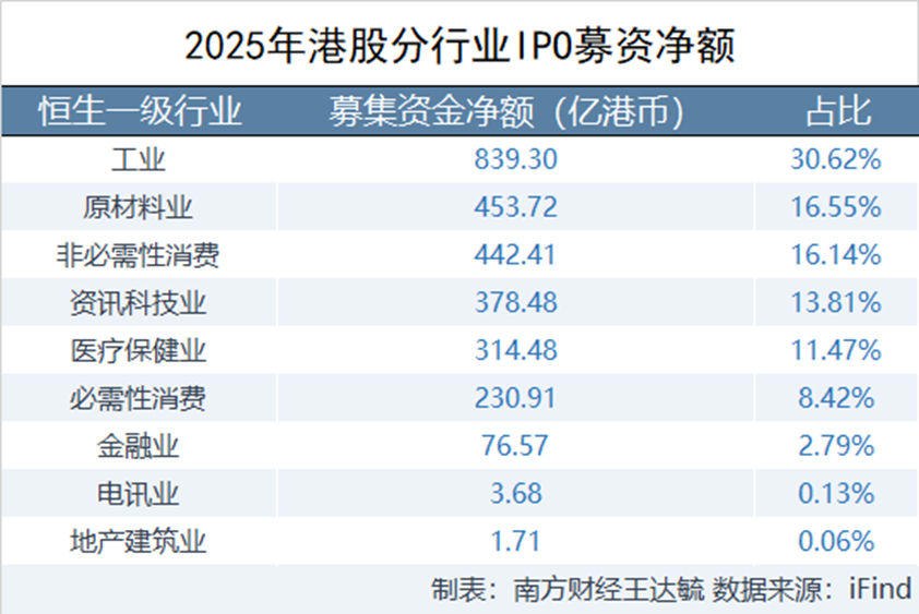 從行業(yè)分布看,根據(jù)數(shù)據(jù),以恒生一級(jí)行業(yè)為分類統(tǒng)計(jì),工業(yè)成為2025年港股IPO募資凈額最高的行業(yè),全年15宗IPO共募集839.30億港幣, 原材料業(yè)、非必需性消費(fèi)、資訊科技業(yè)及醫(yī)療保健業(yè)分列其后。