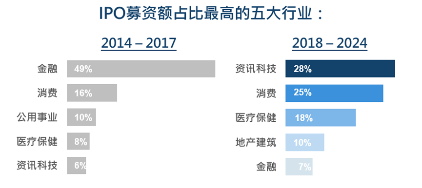 而在2018至2024年間,資訊科技以28%的融資額占比位列所有行業(yè)第一位,醫(yī)療保健也獲得18%的融資額,而金融融資額占比僅為7%。