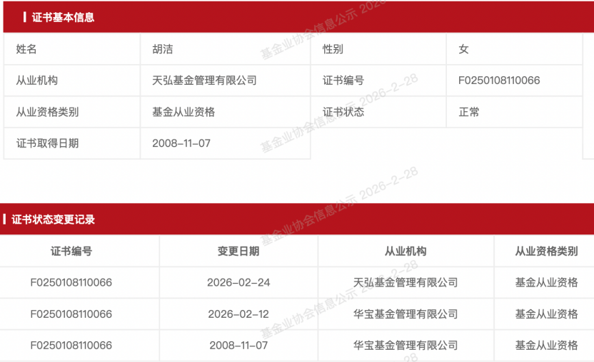 2月28日,澎湃新聞?dòng)浾卟殚喼袊?guó)證券投資基金業(yè)協(xié)會(huì)公示信息發(fā)現(xiàn),胡潔已于2月12日從華寶基金完成注銷,并于2月24日完成從業(yè)機(jī)構(gòu)變更,正式加盟天弘基金。這意味著,這位管理規(guī)模超千億的指數(shù)投資老將,在短短不到兩周時(shí)間內(nèi)完成“無(wú)縫銜接”,開(kāi)啟職業(yè)生涯新篇章。