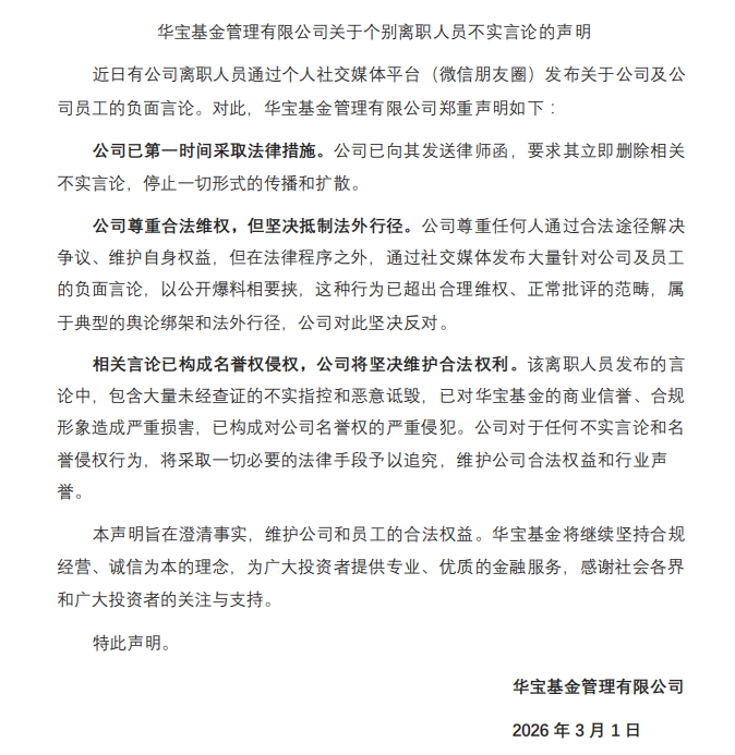 該聲明稱,近日有公司離職人員通過個人社交媒體平臺(微信朋友圈)發(fā)布關于公司及公司員工的負面言論,華寶基金已第一時間采取法律措施,向其發(fā)送律師函,要求其立即刪除相關不實言論,停止一切形式的傳播和擴散。該公司尊重合法維權,但堅決抵制法外行徑。