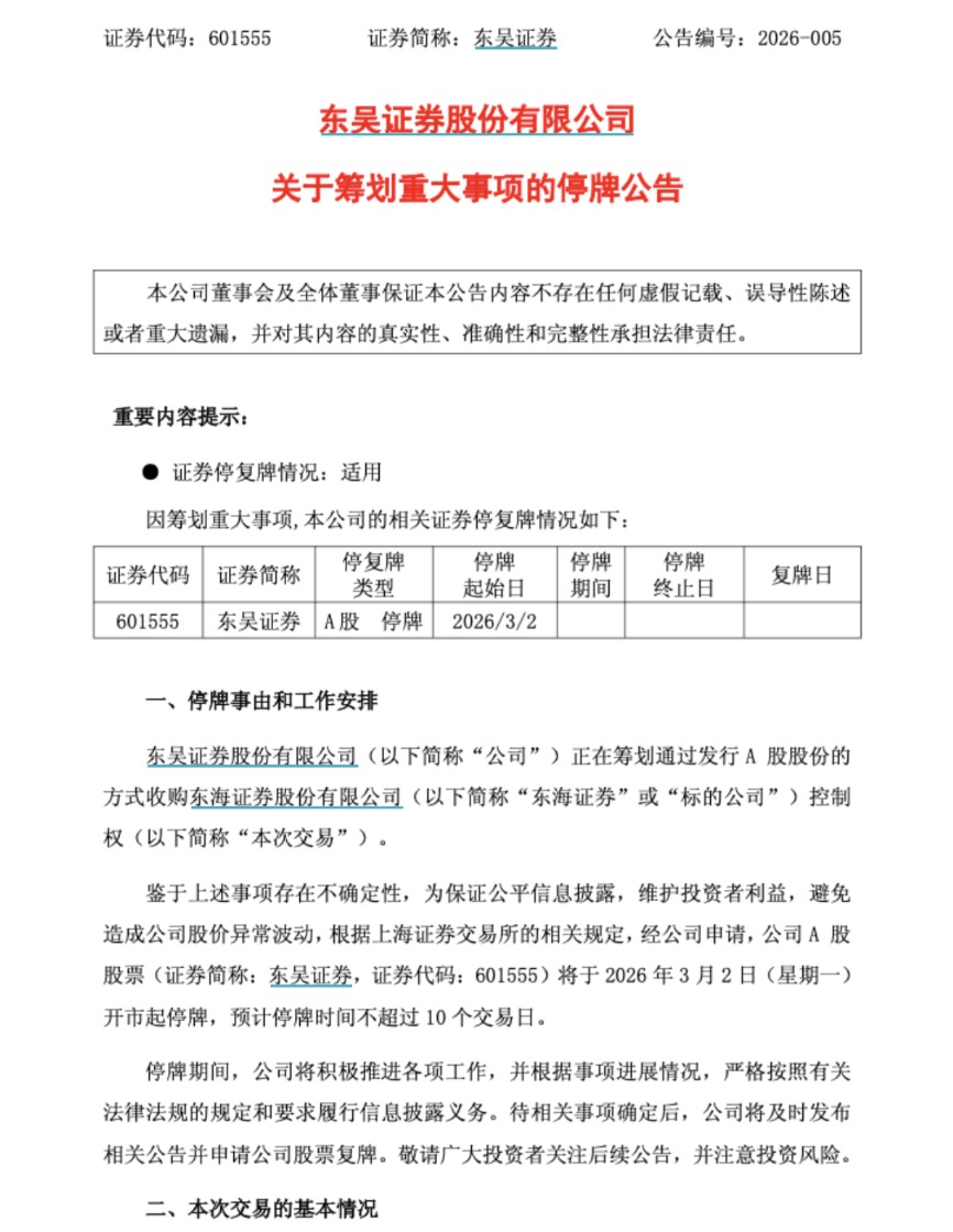 3月2日盤前,東吳證券(601555.SH)公告,公司正在籌劃發(fā)行股份收購東海證券控制權(quán)事項(xiàng)。因該事項(xiàng)存在不確定性,為維護(hù)投資者利益,東吳證券股票自2026年3月2日開市起停牌,預(yù)計(jì)停牌時(shí)間不超過10個(gè)交易日。