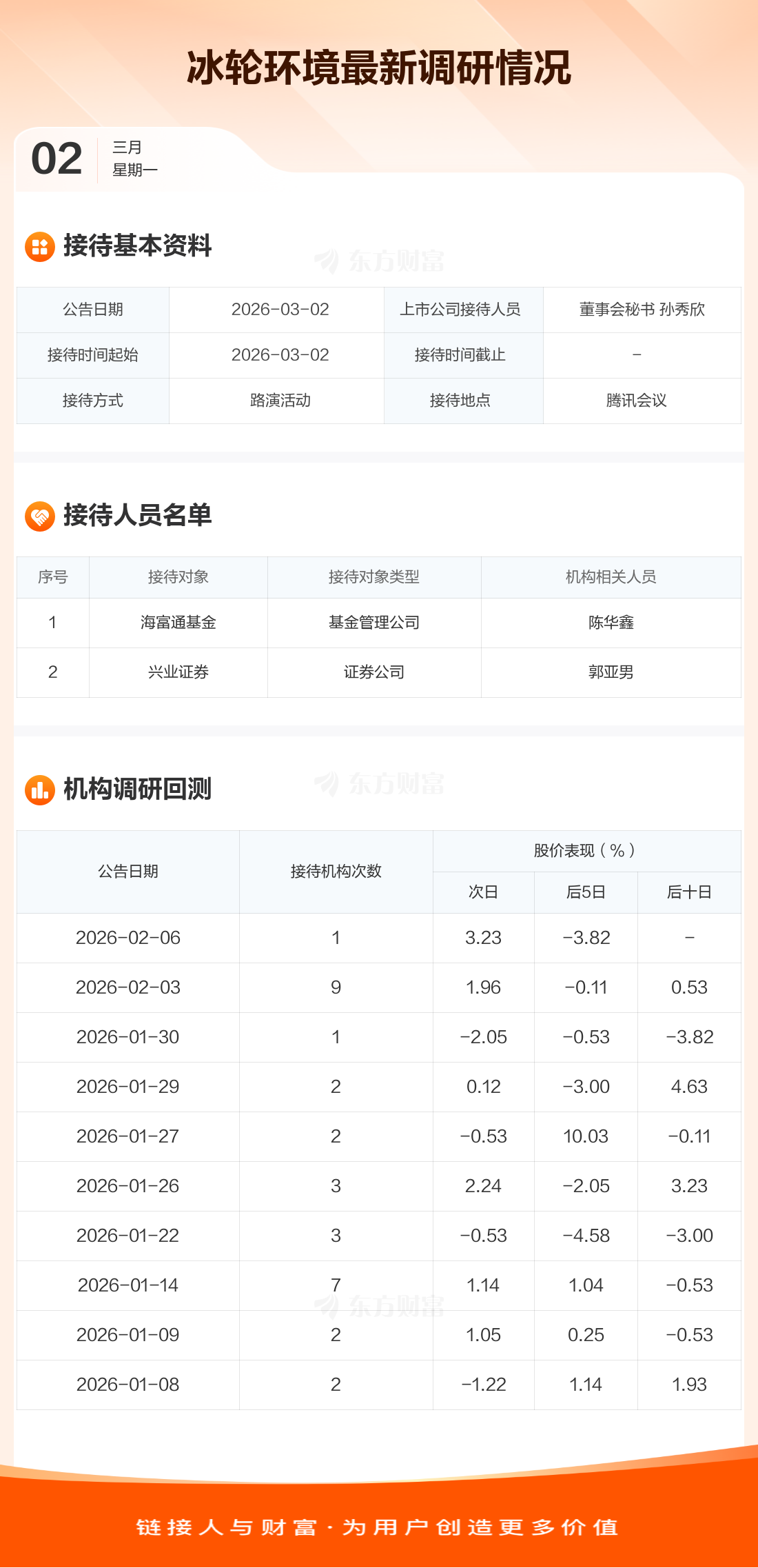 冰輪環(huán)境3月2日公告稱,3月2日接待海富通基金等2家機(jī)構(gòu)調(diào)研。接待人員包括董事會(huì)秘書 孫秀欣。