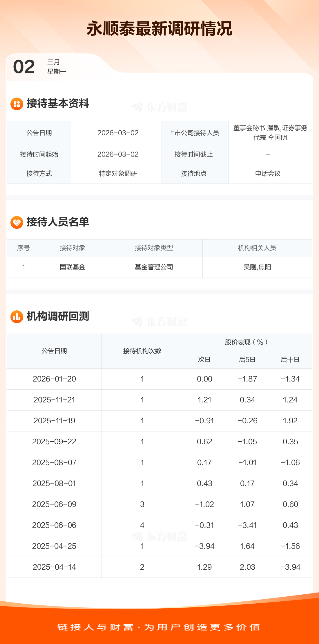 永順泰3月2日公告稱,3月2日接待國聯(lián)基金等1家機構(gòu)調(diào)研。接待人員包括董事會秘書 溫敏,證券事務代表 仝國明。