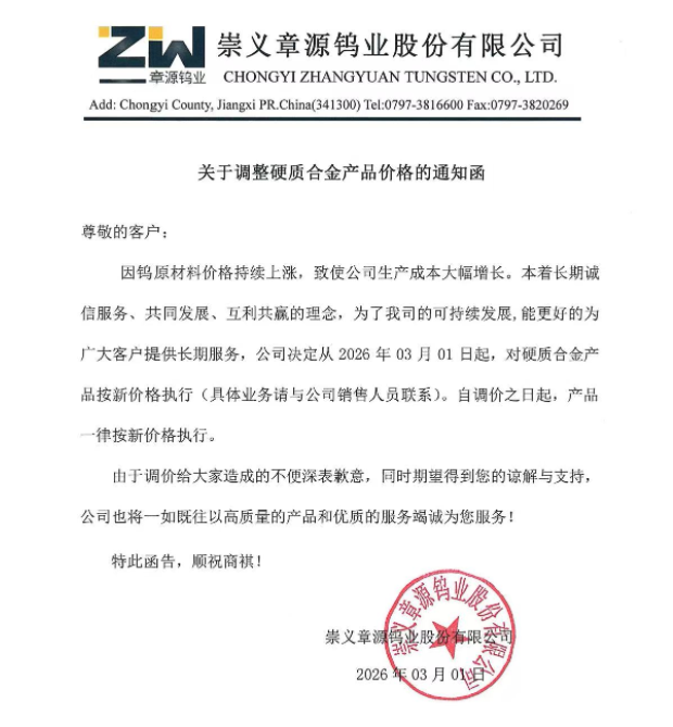 2月26日、3月1日,章源鎢業(yè)便先后宣布,因鎢原材料價(jià)格持續(xù)上漲,致使公司生產(chǎn)成本大幅增長,決定對(duì)其焊接機(jī)夾刀片、硬質(zhì)合金產(chǎn)品價(jià)格進(jìn)行調(diào)整。