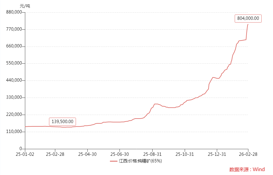 中鎢在線數(shù)據(jù)顯示,3月2日,鎢精礦、仲鎢酸銨、鎢粉等主要產(chǎn)品全線上調(diào),其中最上游的黑鎢精礦、白鎢精礦單日上漲3萬元/標(biāo)噸,最新報(bào)價(jià)達(dá)到83萬元/標(biāo)噸。