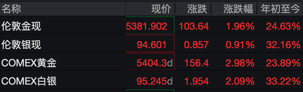 截至發(fā)稿,COMEX黃金報(bào)5404.3美元/盎司,漲2.98%;倫敦金現(xiàn)報(bào)5381.902美元/盎司,漲1.96%,最高摸至5400美元/盎司上方?,F(xiàn)貨白銀漲0.91%,報(bào)94.601美元/盎司;COMEX白銀報(bào)95.245美元/盎司,漲2.09%。