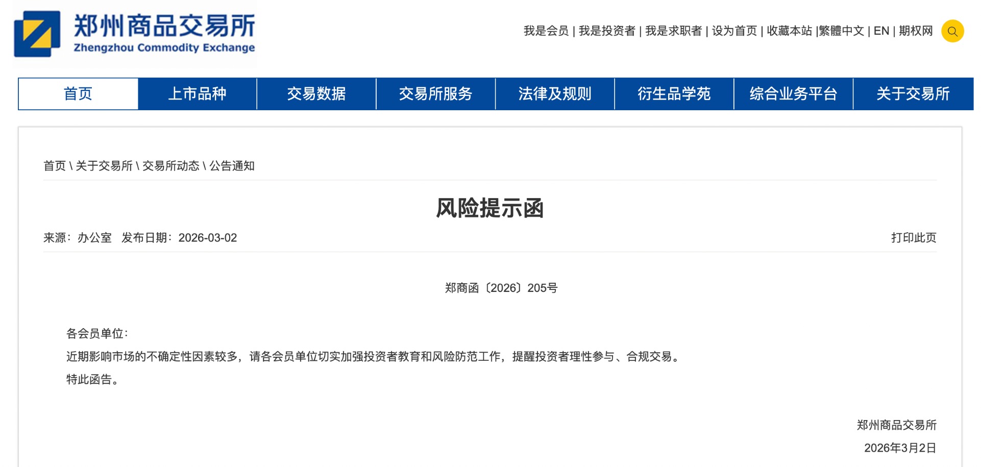 鄭州商品交易所發(fā)布風(fēng)險(xiǎn)提示函稱(chēng),近期影響市場(chǎng)的不確定性因素較多,請(qǐng)各會(huì)員單位切實(shí)加強(qiáng)投資者教育和風(fēng)險(xiǎn)防范工作,提醒投資者理性參與、合規(guī)交易。