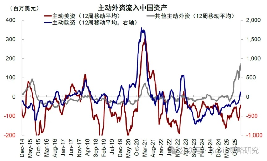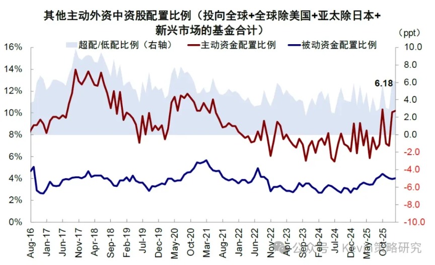2025年以來,外資已經(jīng)局部流入中國(guó)資產(chǎn),除了被動(dòng)外資、主動(dòng)外資中的區(qū)域型資金如亞太地區(qū)基金也自8月起明顯流入中國(guó)資產(chǎn),背后可能有A股行情活躍、以及反內(nèi)卷等政策的影響。然而,亞太資金畢竟只是主動(dòng)外資中的一部分,歐美資金的低配程度不僅沒有縮小反而擴(kuò)大,呈現(xiàn)“二元分化”格局,所以加在一起看,整體主動(dòng)外資的流入在2025年仍不明顯。不過今年初以來,我們注意到主動(dòng)外資連續(xù)七周流入中國(guó)市場(chǎng),為2023年2月以來的首次,尤其值得關(guān)注的是,歐美主動(dòng)資金也出現(xiàn)流入跡象。
