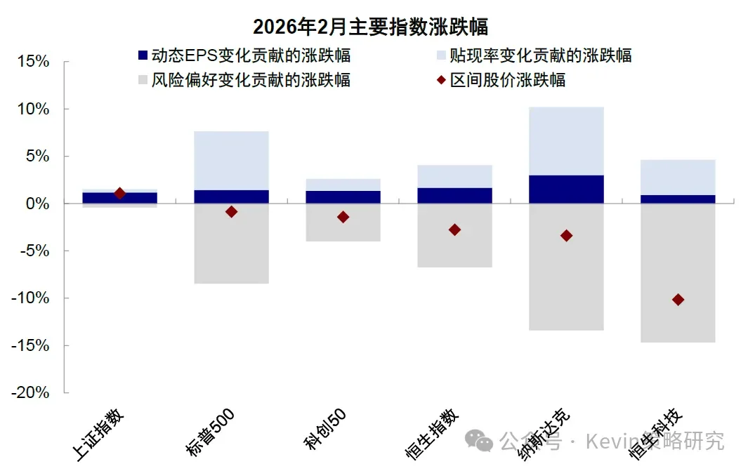 近期港股整體跑輸,尤其是作為“核心資產(chǎn)”的恒生科技表現(xiàn)“墊底”。截至2月28日,恒指下跌2.8%(vs. 上證指數(shù)上漲1.1%、標(biāo)普500下跌0.9%),恒生科技更是大跌10.1%(vs. 科創(chuàng)50和納斯達(dá)克下跌1.4%和3.4%)。恒科自10月高點(diǎn)以來回撤20%、且連續(xù)跌破多個(gè)技術(shù)支撐位,如果對(duì)比韓國(guó)年初以來近50%的漲幅,反差更是強(qiáng)烈。從驅(qū)動(dòng)因素看,相比盈利和無(wú)風(fēng)險(xiǎn)利率的正貢獻(xiàn),股權(quán)風(fēng)險(xiǎn)溢價(jià)(即情緒和敘事)是核心原因,拖累了14.7 ppt;從成分股看,頭部5個(gè)權(quán)重股就拖累6.0ppt的下跌。