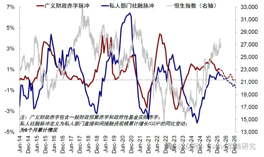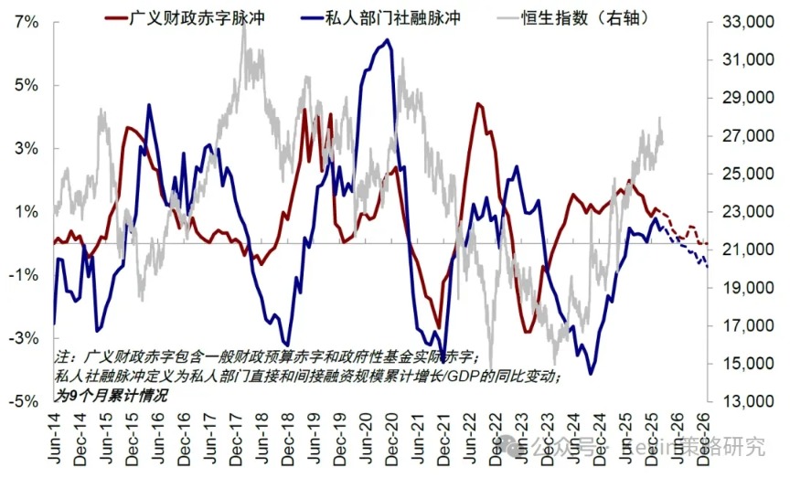 因此往前看,今年初以來主動(dòng)外資尤其是歐美主動(dòng)外資的流入能否持續(xù),基本面仍是關(guān)鍵,而基本面背后則是信用周期的走向。目前來看,受收入預(yù)期偏弱、回報(bào)與成本倒掛問題影響,私人部門傳統(tǒng)需求仍有不足,高基數(shù)下2026年私人社融脈沖或繼續(xù)走弱;作為對(duì)沖的財(cái)政若僅是維持2025年的支持力度,廣義財(cái)政赤字脈沖也大概率將繼續(xù)走低,這也意味著,基準(zhǔn)情形下,若政策僅發(fā)揮托底作用,2026年信用周期整體震蕩放緩但產(chǎn)業(yè)趨勢(shì)延續(xù)。