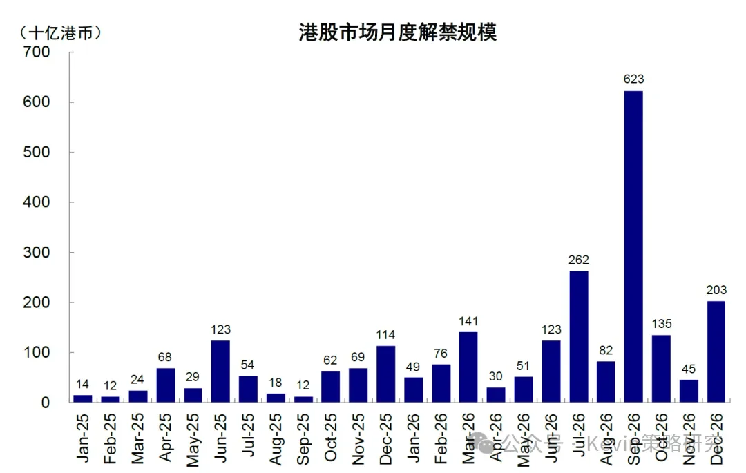 1)主動(dòng)外資:如果其對(duì)中國(guó)資產(chǎn)超配比例回升至2020-2025年均值水位(約低配0.58ppt),則對(duì)應(yīng)大約2000-2500億港元流入;樂觀情況下,若主動(dòng)外資回歸標(biāo)配,則對(duì)應(yīng)5000-5500億港元流入。2)南向資金中可測(cè)算部分,公募(約貢獻(xiàn)3000-4000億港元)與險(xiǎn)資(約3500億港元)共可貢獻(xiàn)6500-7500億港元。此外,1.8萬(wàn)億港元的解禁規(guī)模也可能成為2026年港股資金面潛在的壓力。