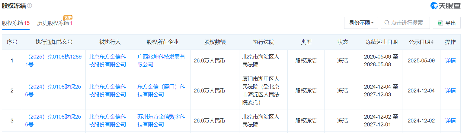 《財(cái)中社》注意到,除了屢屢成為法院被執(zhí)行人外,東方金信股權(quán)多次被凍結(jié)。天眼查顯示,公司最近一筆股權(quán)凍結(jié)是在2025年5月,執(zhí)行法院是北京市海淀區(qū)人民法院,股權(quán)金額是26萬元,凍結(jié)起止日期從2025年5月9日至2028年5月8日。
