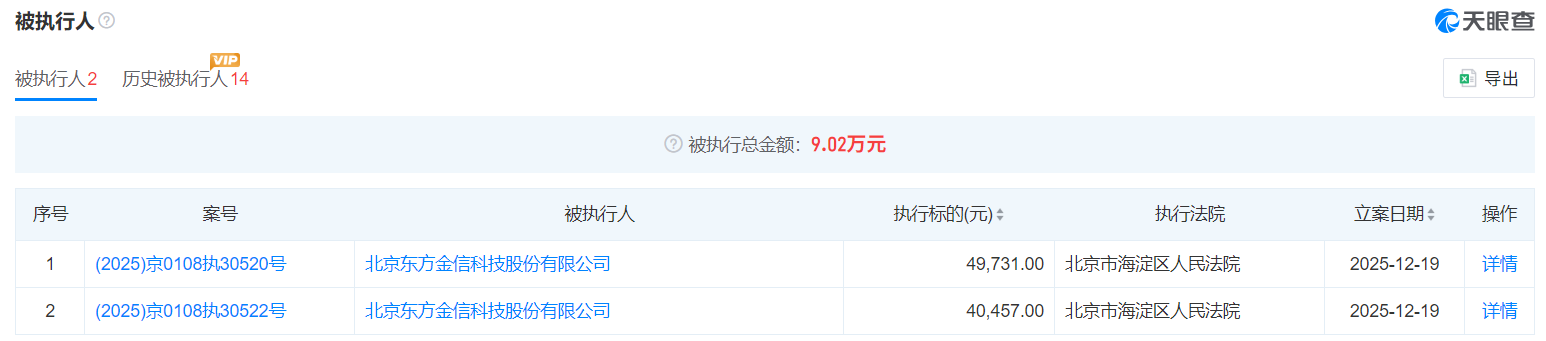 然而,工商信息中,東方金信還有另外一種景象。天眼查信息顯示,東方金信早已經(jīng)登上“被執(zhí)行人”名單。2025年12月,北京市海淀區(qū)人民法院的兩筆合計(jì)9萬元的執(zhí)行金額,讓東方金信成為被執(zhí)行人。