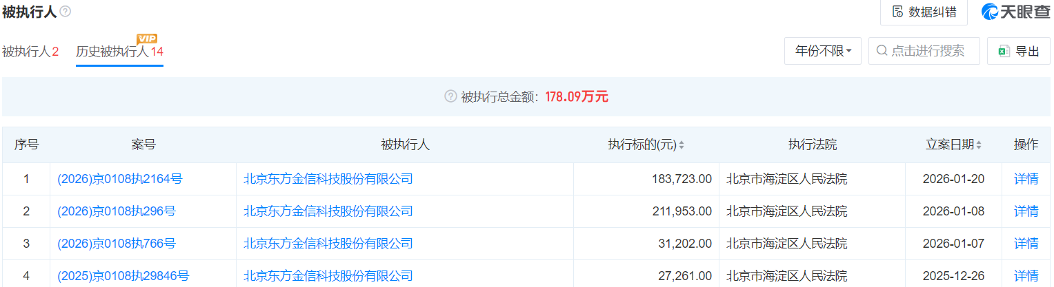 這并不是全部,歷史被執(zhí)行人名單中,東方金信14次上榜。最早的一次是2025年2月,最近的一次是2026年1月下旬。14次成為被執(zhí)行人的金額并不大,合計(jì)只有178萬元。執(zhí)行法院除一家屬于重慶外,其余全部來自北京市海淀區(qū)人民法院。