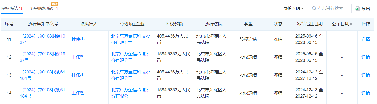 在這15筆股權(quán)凍結(jié)通知中,9筆凍結(jié)對象為東方金信。還有兩次是公司第一大股東王偉哲,凍結(jié)股權(quán)數(shù)額均為1585萬元。兩次時(shí)間不同,前一次是2024年12月開始凍結(jié),后一次是2025年6月。