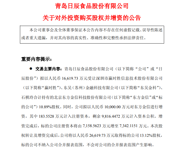 日辰股份日前公告,公司計(jì)劃2.7億元收購東方金信13.12%股份。其中,1.7億元收購贏時(shí)勝(300377)和東吳(蘇州)金融科技有限公司持有的東方金信10.89%股份,剩余1億元用于增資東方金信。