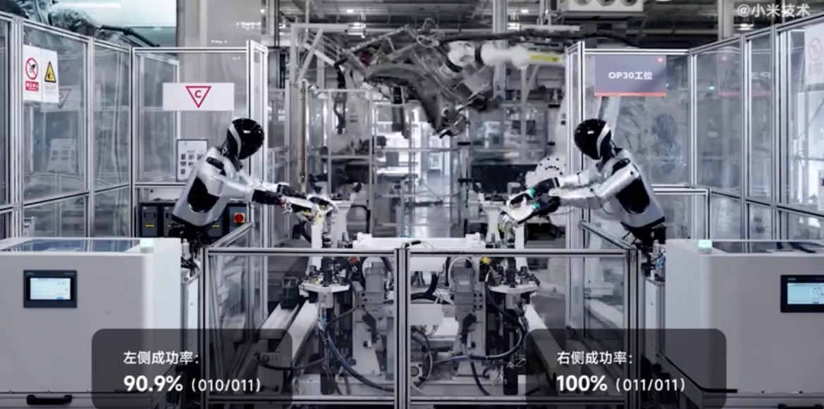 近日,雷軍在微博透露,小米機(jī)器人已經(jīng)進(jìn)入汽車工廠工作,展示了自主安裝螺絲、搬運(yùn)料箱及安裝車標(biāo)等多項(xiàng)能力。在真實(shí)環(huán)境中,它能連續(xù)運(yùn)行3小時(shí),安裝成功率達(dá)90.2%,最快76秒完成生產(chǎn)節(jié)拍要求。