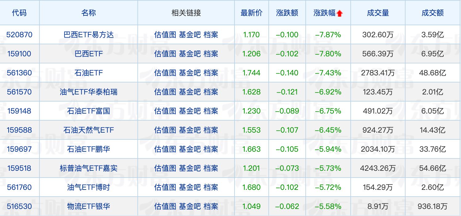 下跌方面,巴西、石油相關(guān)ETF跌超7%。