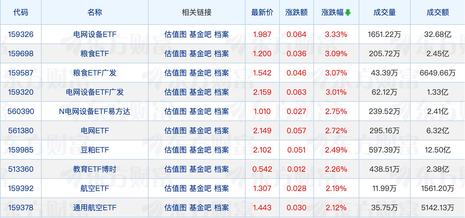 ETF漲跌幅方面,電網(wǎng)設(shè)備、糧食相關(guān)ETF漲超3%。