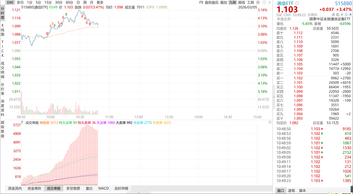 今日,通信ETF(515880)盤中大幅拉升,盤中漲幅超5%,成為A股科技賽道核心領漲品種,這一輪強勢上漲并非偶然,而是事件催化、產業(yè)景氣、資金共識、產品結構四重邏輯共振的結果。