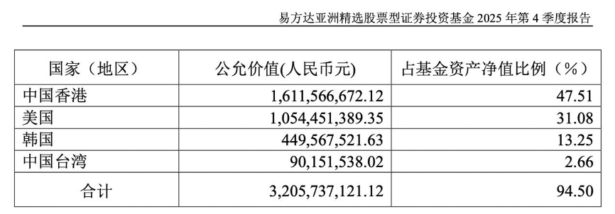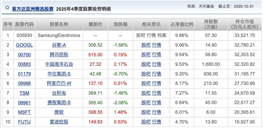 值得注意的是,去年四季度末,三星電子更是成為易方達(dá)亞洲精選股票的頭號重倉股。2025年四季度末,該產(chǎn)品對三星電子的持倉比例達(dá)9.88%,與2025年三季度末的8.06%相比提升近2個百分點。