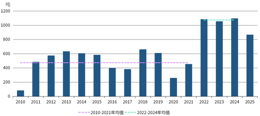 2025年全球央行購金需求依然保持堅(jiān)挺。2025年第四季度,全球央行凈購金量大幅上升,較上季度增長6%,至230噸。2025年央行購金總量為863噸,與此前連續(xù)三年均超過1000噸的水平相比偏低,但仍處于近10年的相對(duì)高位。2025年全球央行的強(qiáng)勁購金表現(xiàn),尤其是新興市場(chǎng)央行的活躍購金行為,有力地支撐了金價(jià)走勢(shì)。