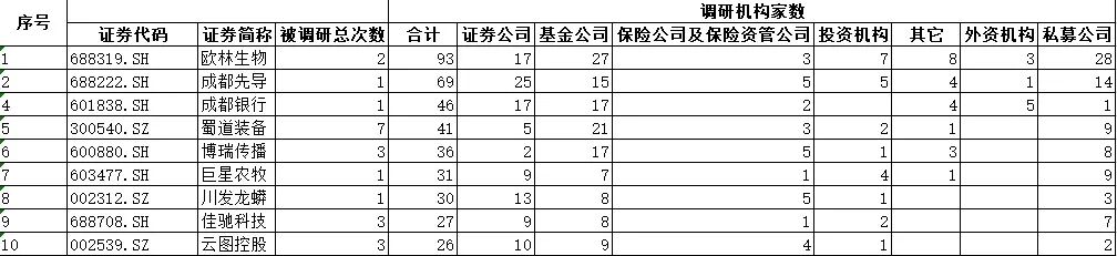 從機(jī)構(gòu)調(diào)研頻次來(lái)看,共有18家川股獲得超過(guò)兩位數(shù)的機(jī)構(gòu)調(diào)研。其中,歐林生物的調(diào)研機(jī)構(gòu)家數(shù)高居榜首,達(dá)到93家。