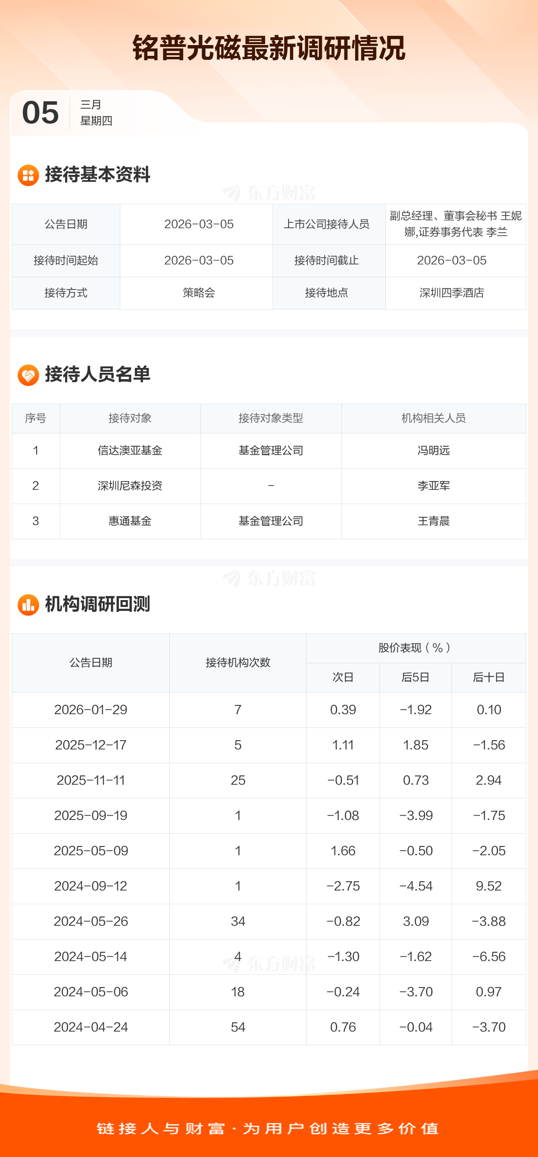 銘普光磁3月5日公告稱,3月5日接待信達(dá)澳亞基金等3家機(jī)構(gòu)調(diào)研。接待人員包括副總經(jīng)理、董事會秘書 王妮娜,證券事務(wù)代表 李蘭。