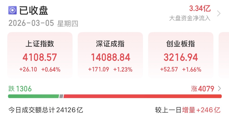 三大股指全天震蕩走強,收盤均報漲。滬指成功收復(fù)4100點整數(shù)關(guān)口,漲0.64%;深證成指報14088.84,漲1.23%;創(chuàng)業(yè)板指報3216.94,漲1.66%。兩市超4000只股票上漲,近80只股票漲停。