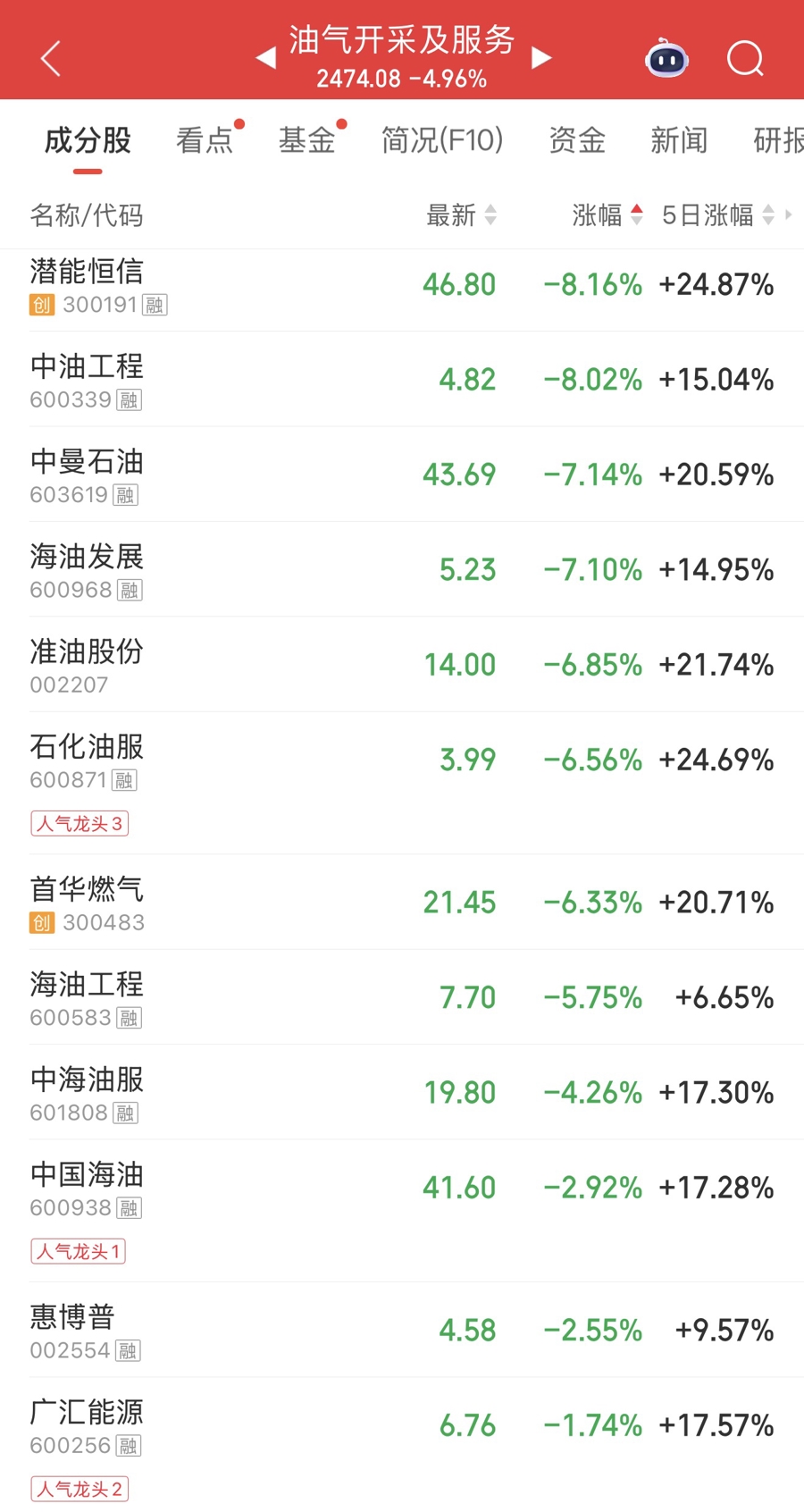 但此前因油價上漲預(yù)期走強的油氣板塊,開始回吐之前漲幅,“三桶油”紛紛收跌,其中中國石化更是下跌5%。