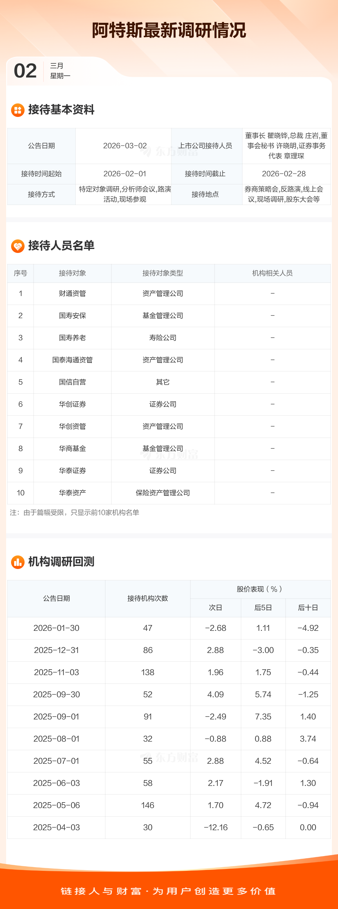 阿特斯3月2日公告稱,2月1日至2月28日接待財(cái)通資管等47家機(jī)構(gòu)調(diào)研。接待人員包括董事長 瞿曉鏵,總裁 莊巖,董事會秘書 許曉明,證券事務(wù)代表 章理琛。