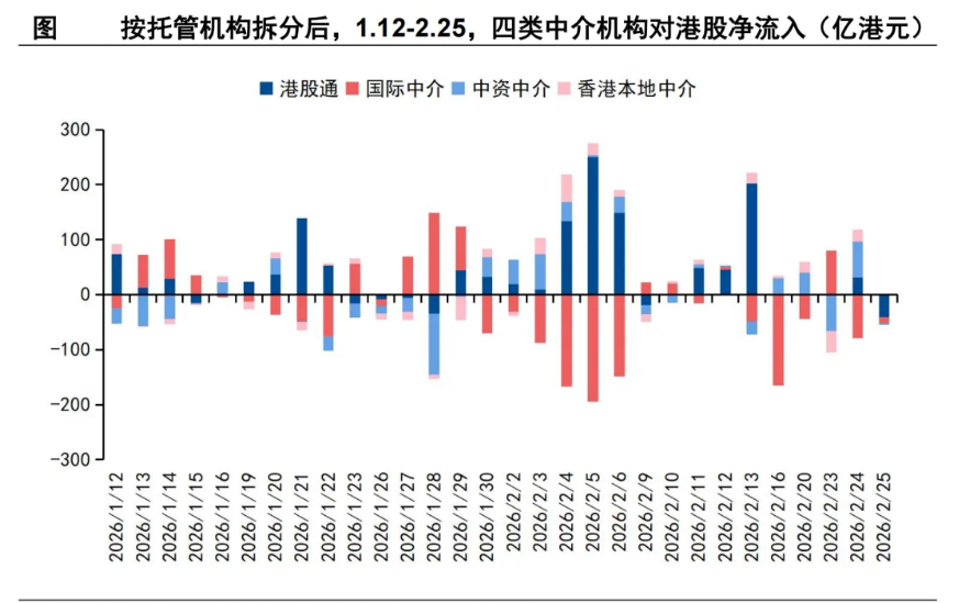 國際中介的賣出或是拖累港股流動性的核心。根據(jù)港交所托管機構(gòu)數(shù)據(jù),26年以來,截至2月25日,南下資金凈流入1519.1億港元,國際中介凈流出621.9億港元(尤其是1月底開始加速減倉),中資中介減倉213.9億港元,香港本地中介加倉87.1億港元。但考慮到EPFR數(shù)據(jù)顯示主被動共同基金今年以來持續(xù)加倉港股,尤其是主動外資已經(jīng)連續(xù)7周回流,我們推測近期減倉港股的外資主力或主要是海外對沖基金。