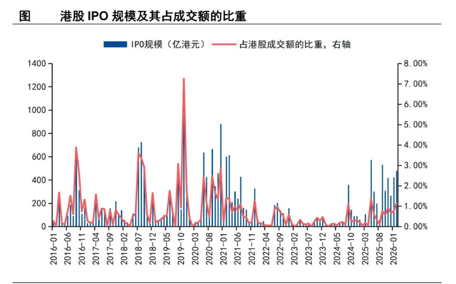 此外,外資做空規(guī)模攀升,疊加IPO和解禁規(guī)模邊際上升,或也加劇了港股資金面供需失衡的壓力。做空方面,26年1月中下旬至2月底,港股做空成交占比MA5由12.6%飆升至20%左右的高位。IPO方面,2月港股IPO規(guī)模近490億港元,占港股市場成交額的比重為1.14%,較去年Q4和今年1月明顯上升。解禁方面,2月港股解禁規(guī)模794.7億港元,環(huán)比1月邊際提升。