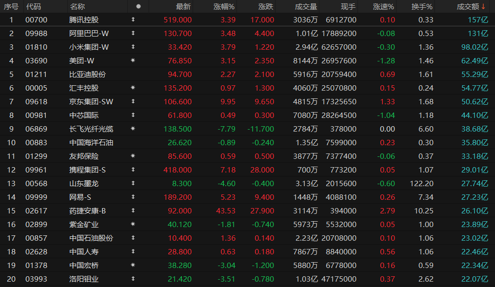 港股成交額前二十