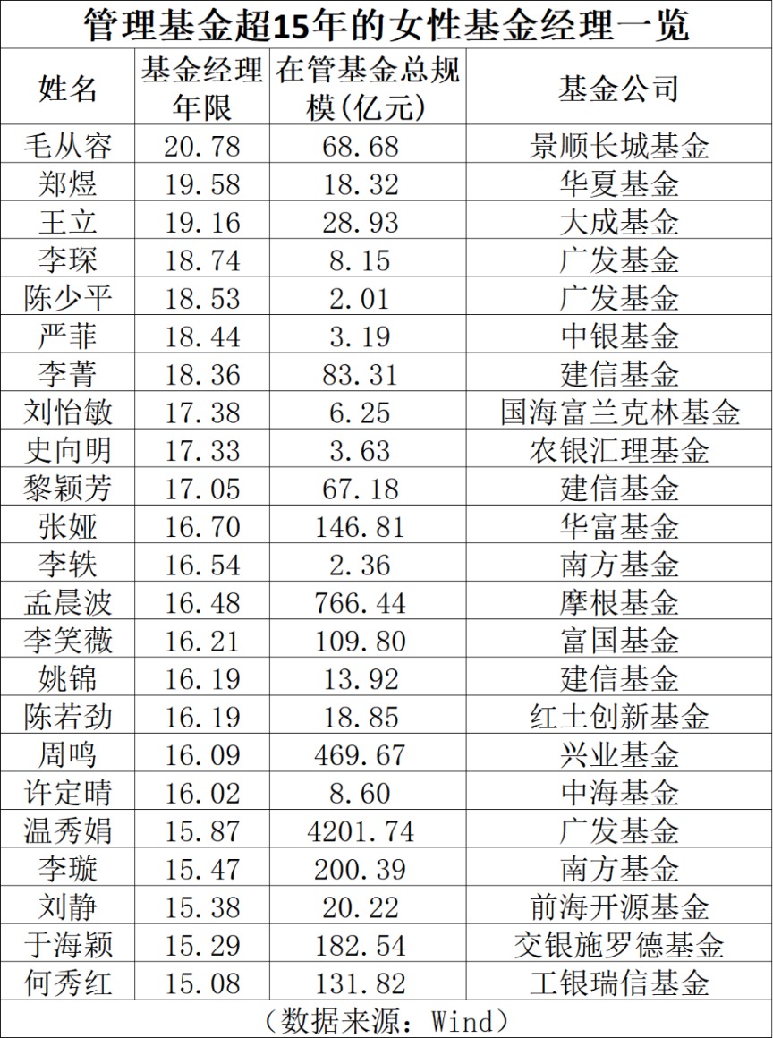 華夏基金鄭煜、大成基金王立任職基金經(jīng)理年限也進入第20個年頭。廣發(fā)基金李琛和陳少平、中銀基金嚴(yán)菲、建信基金李菁、國海富蘭克林劉怡敏、農(nóng)銀匯理史向明、建信基金黎穎芳等多位女將任職年限超過17年,成為行業(yè)中流砥柱。