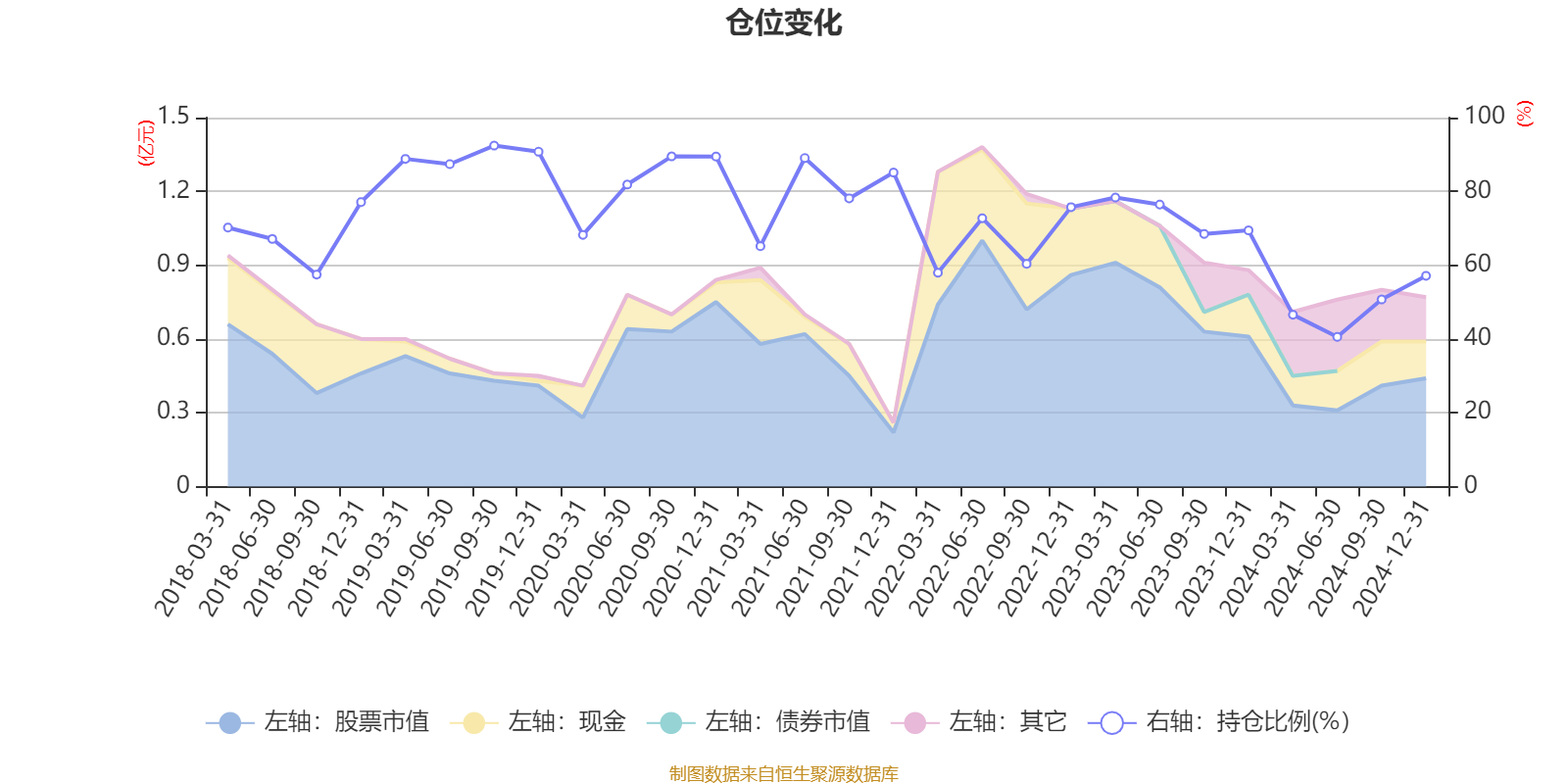 據(jù)定期報告數(shù)據(jù)統(tǒng)計,近三年平均股票倉位為62.87%,同類平均為79.9%。2019年三季度末基金達到92.41%的最高倉位,2024年上半年末最低,為40.58%。