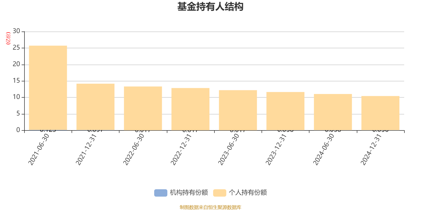 截至2024年12月31日,基金持有人共計1.79萬戶,合計持有10.41億份。其中管理人員工持有7.48萬份,占比0.01%,機構(gòu)持有份額占比0.54%,個人投資者占比99.46%。