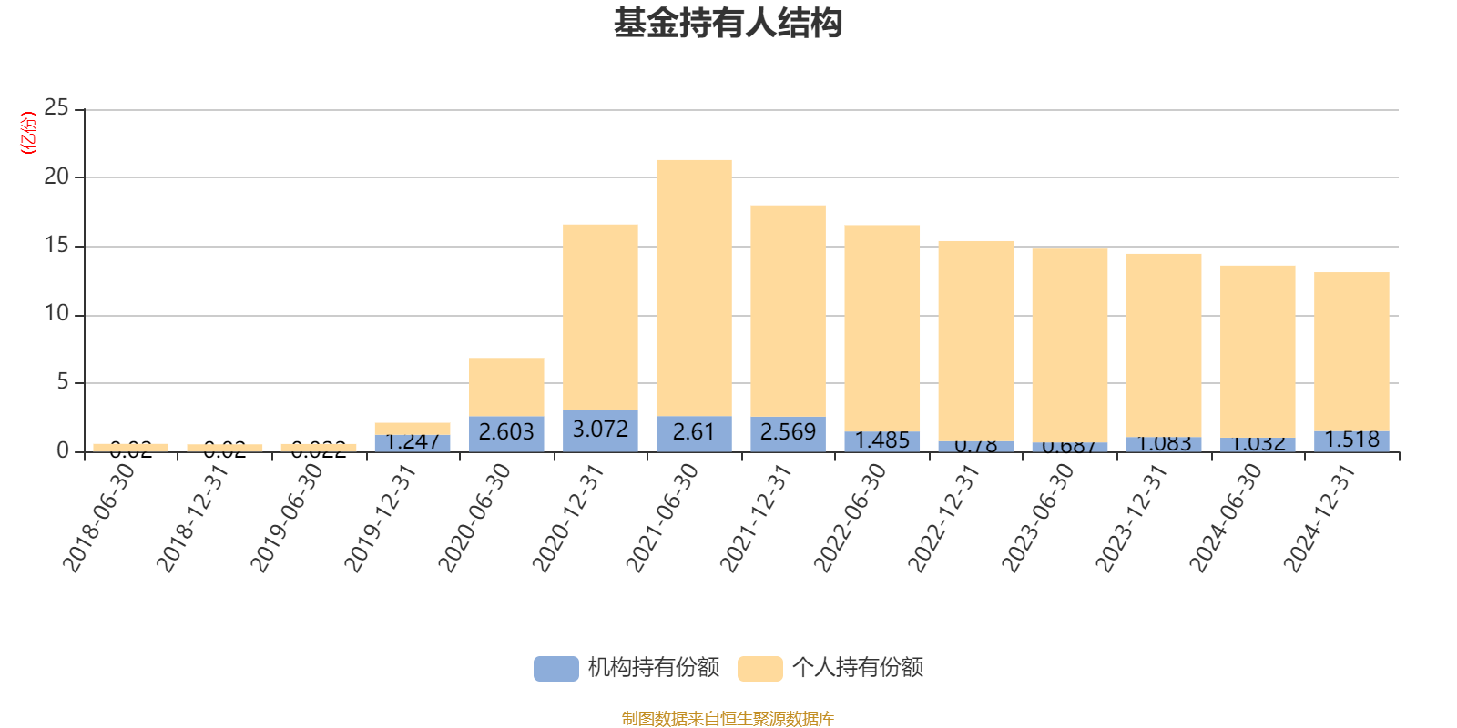 截至2024年12月31日,基金持有人共計20.74萬戶,合計持有13.11億份。其中管理人員工持有21.59萬份,占比0.02%,機構(gòu)持有份額占比11.58%,個人投資者占比88.42%。