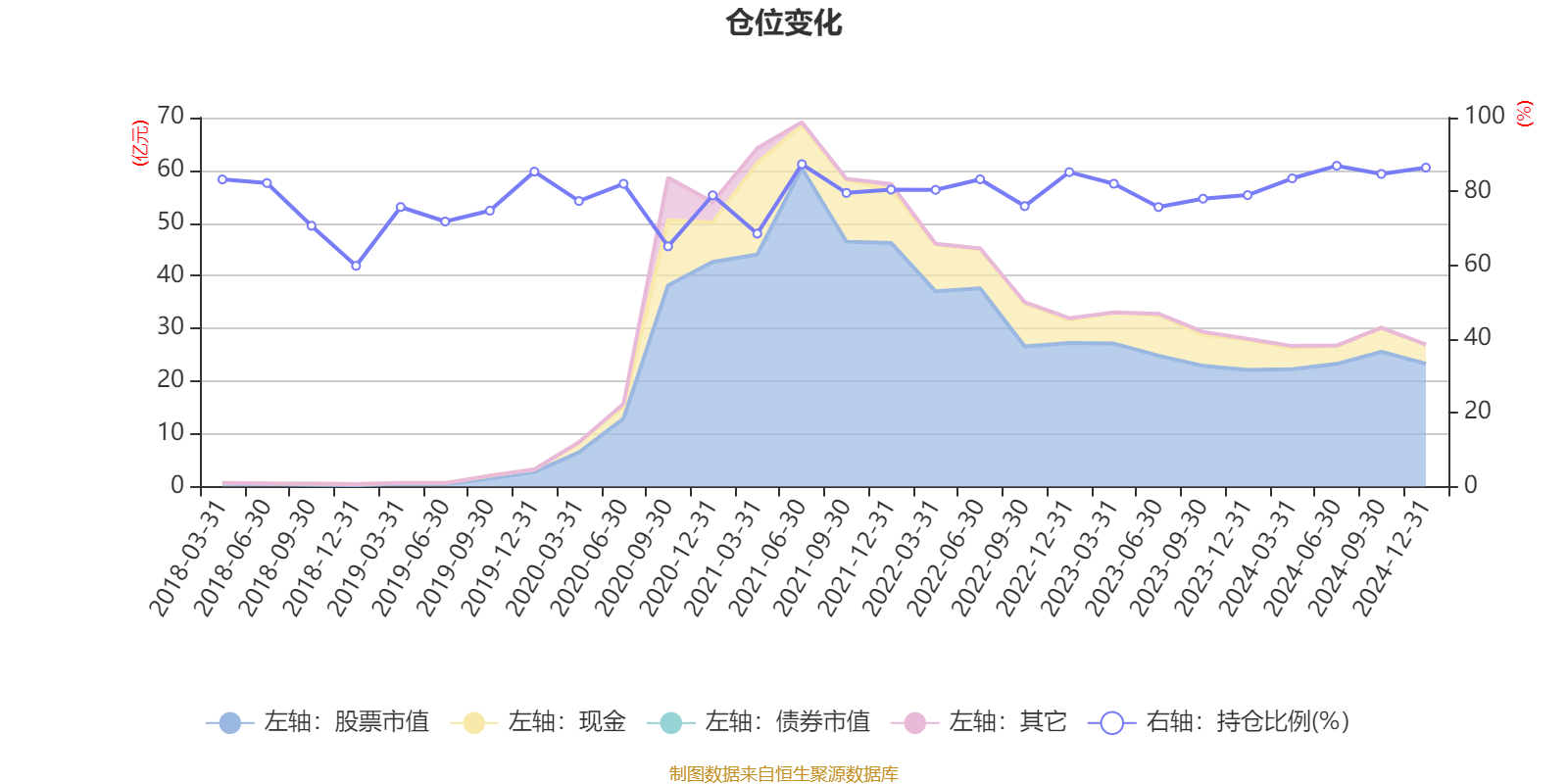 據(jù)定期報告數(shù)據(jù)統(tǒng)計,近三年平均股票倉位為81.79%,同類平均為79.88%。2021年上半年末基金達到87.38%的最高倉位,2018年末最低,為59.83%。