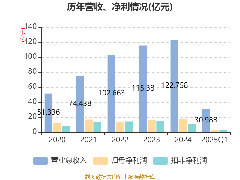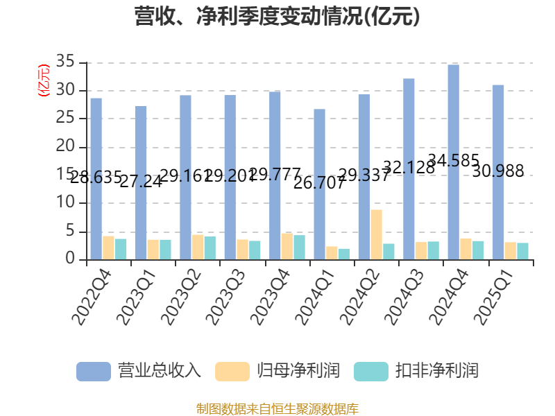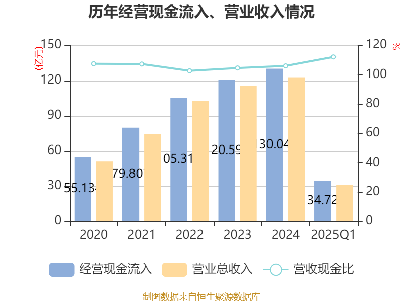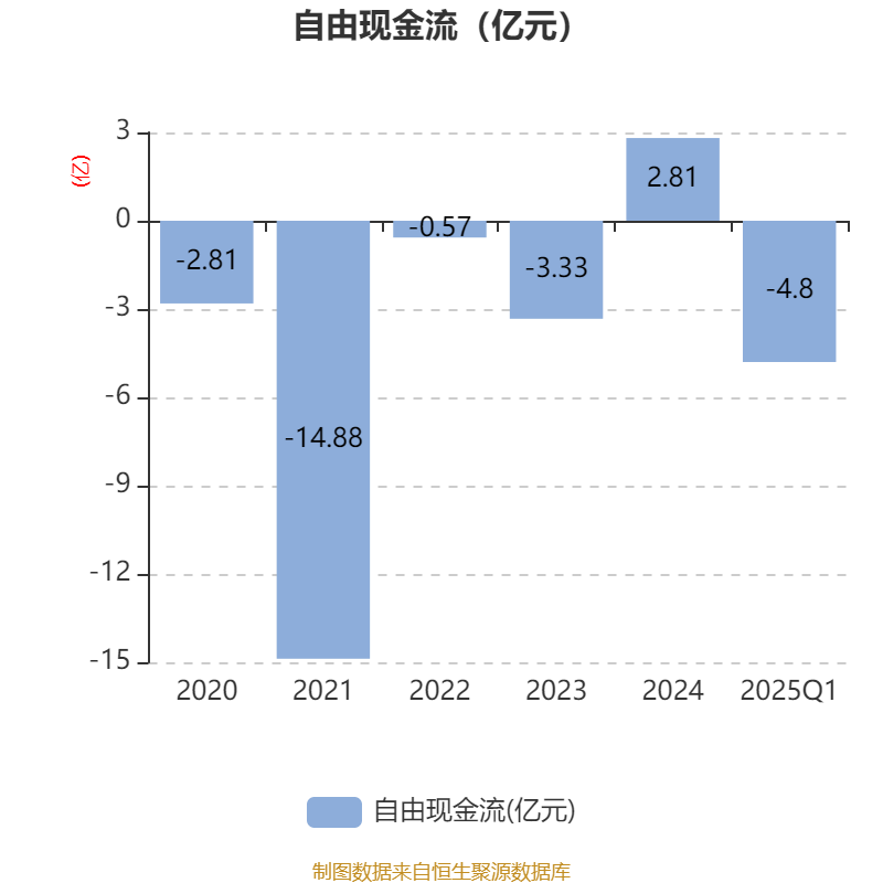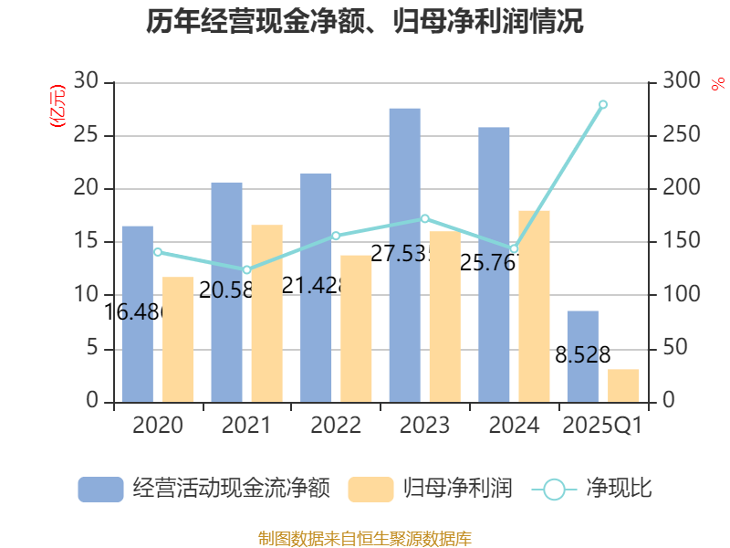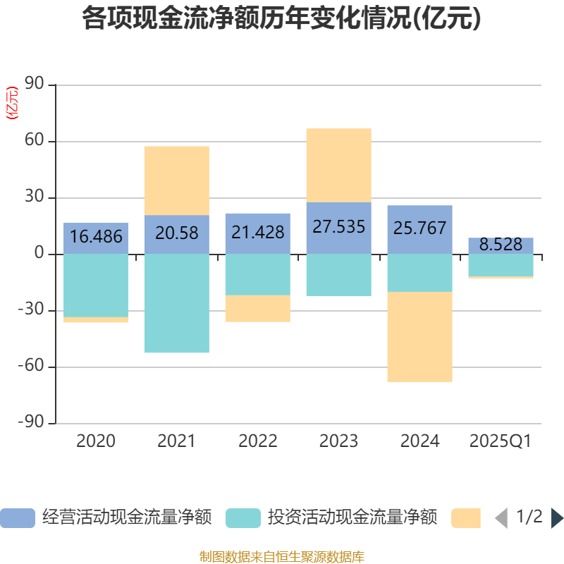 截至2025年一季度末,公司經(jīng)營活動現(xiàn)金流凈額為8.53億元,同比增長14.38%;籌資活動現(xiàn)金流凈額-9892.67萬元,同比增加14.14億元;投資活動現(xiàn)金流凈額-12.12億元,上年同期為-4.67億元。