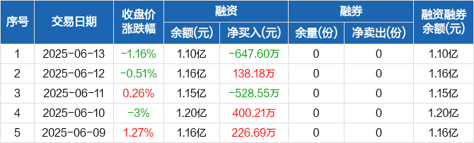 融資方面,當日融資買入1357.81萬元,融資償還2005.41萬元,融資凈償還647.6萬元。融券方面,融券賣出0份,融券償還0份,融券余量0份,融券余額0元。融資融券余額合計1.1億元。
