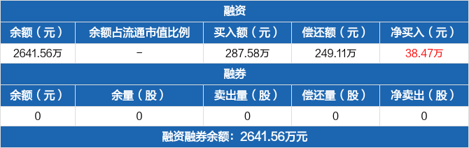 融資方面,當(dāng)日融資買入287.58萬元,融資償還249.11萬元,融資凈買入38.47萬元。融券方面,融券賣出0份,融券償還0份,融券余量0份,融券余額0元。融資融券余額合計(jì)2641.56萬元。