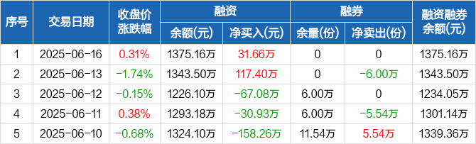 融資方面,當(dāng)日融資買入185.28萬元,融資償還153.63萬元,融資凈買入31.66萬元。融券方面,融券賣出0份,融券償還0份,融券余量0份,融券余額0元。融資融券余額合計(jì)1375.16萬元。