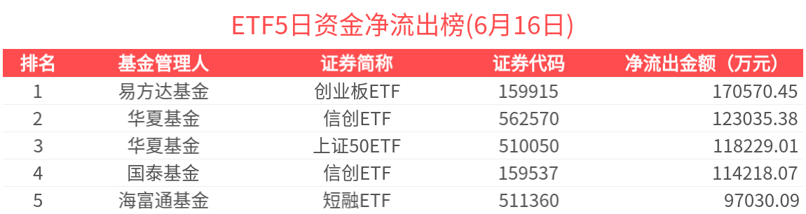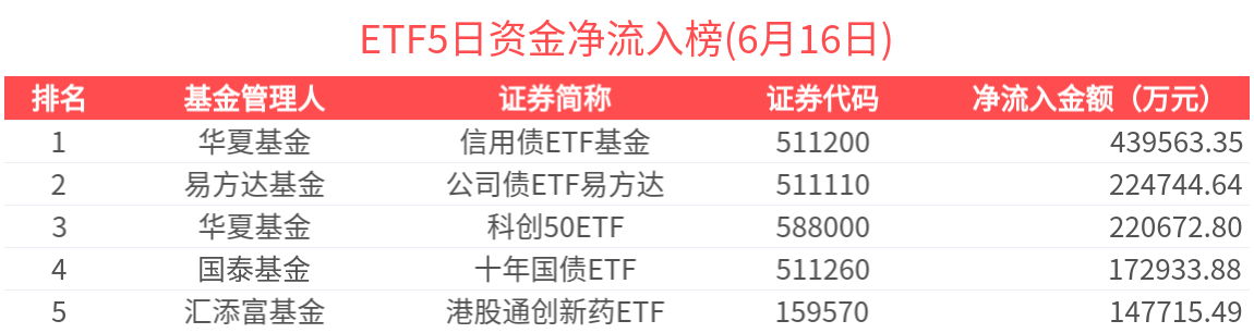 2025年6月16日共247只ETF基金獲資金凈流入,313只ETF基金凈流出。凈流入金額超1億元的有37只,滬深300ETF(510300.SH)、信用債ETF基金(511200.SH)、上證50ETF(510050.SH)、中證500ETF(510500.SH)、公司債ETF易方達(511110.SH)資金顯著流入,分別凈流入16.95億元、13.73億元、8.70億元、5.78億元、5.34億元(凈申購份額*單位凈值)。