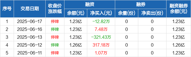 融資方面,當日融資買入7176.58萬元,融資償還7189.4萬元,融資凈償還12.82萬元。融券方面,融券賣出0份,融券償還0份,融券余量0份,融券余額0元。融資融券余額合計1.23億元。