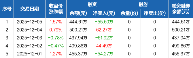 融資方面,當(dāng)日融資買入100.87萬元,融資償還156.46萬元,融資凈償還55.6萬元。融券方面,融券賣出0份,融券償還0份,融券余量0份,融券余額0元。融資融券余額合計444.61萬元。