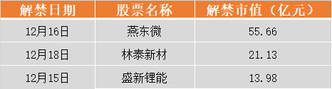具體來看,燕東微12月16日將解禁1.93億股,為首發(fā)原股東限售股份;林泰新材12月18日將解禁0.26億股,為首發(fā)原股東限售股份;盛新鋰能12月15日將解禁0.47億股,為定向增發(fā)機構(gòu)配售股份。